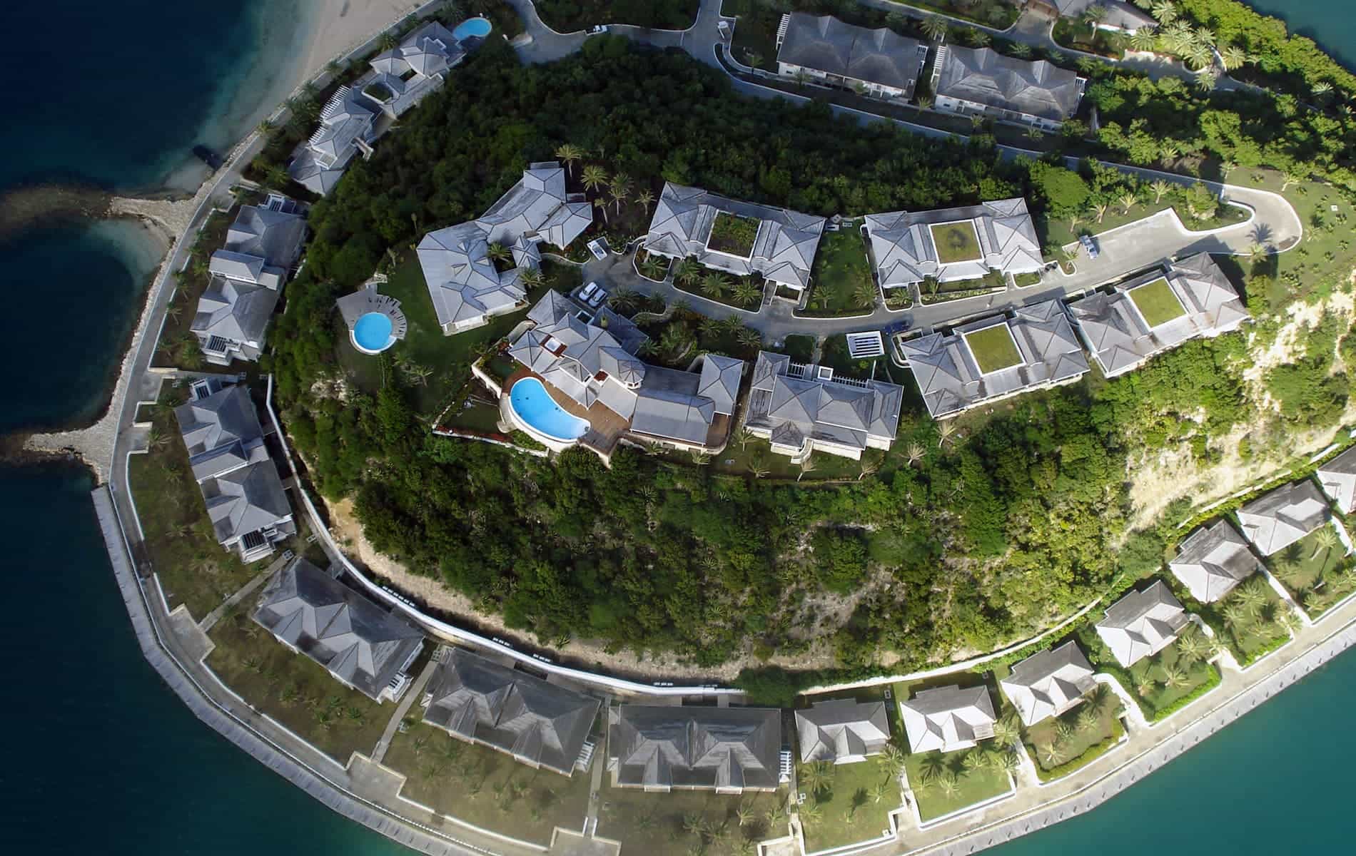 The Hilltop estate comprises four detached villas totaling 17,000 sq ft containing 16-bedroom suites, 2 swimming pools with sun decks and a gym, constructed during 2007-2008, and which can be separately gated from the remainder of the 200 acre Emerald Cove resort with its fine white sandy beaches, a boutique hotel, beach club with restaurant, beachfront bar, a stunning swimming pool, and a proposed golf course, amongst other private residences including the 35,000 sq ft Berlusconi estate on the adjacent hilltop.